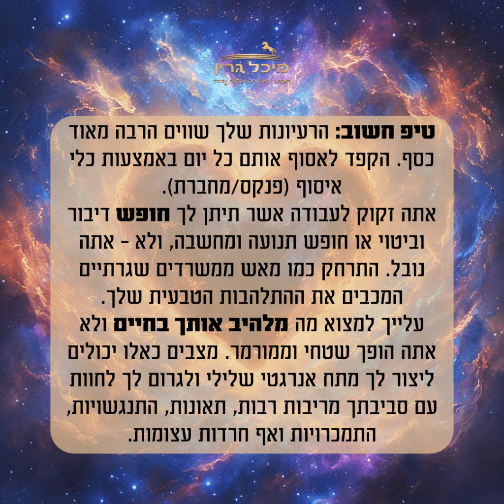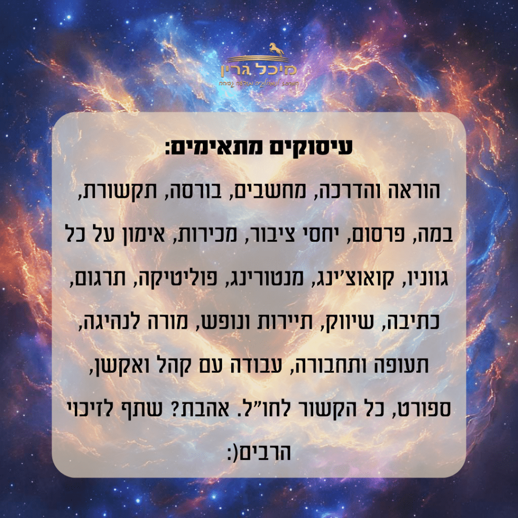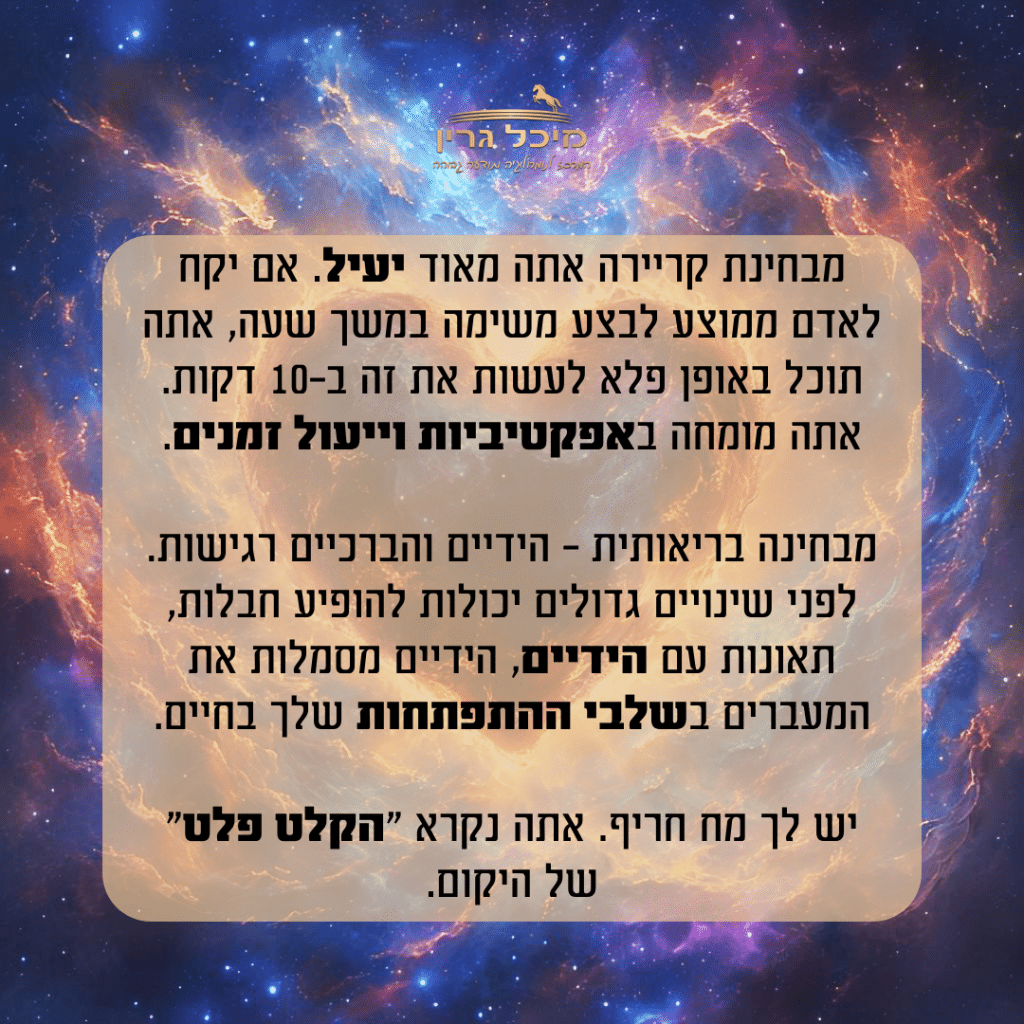 היא עילוי בכל הקשור לקריירה🔝 זקוקה למשמעת עצמית כדי להגיע להישגים לאורך זמן ופחות לזריקות מוטיבציה מהירות, שגורמות לה להתחיל גבוה ולהתעייף מהר. מסגרת עושה לה טוב כשהיא שם עם האנשים הנכונים.