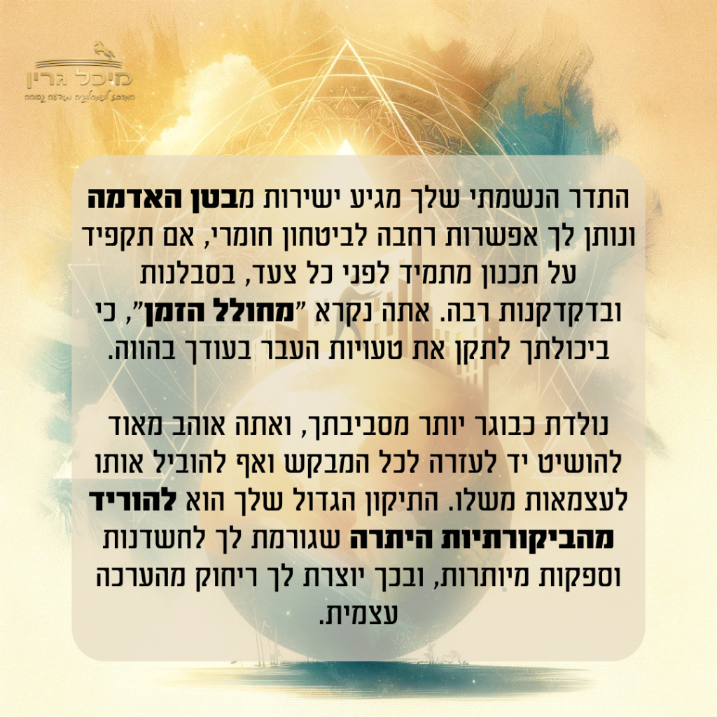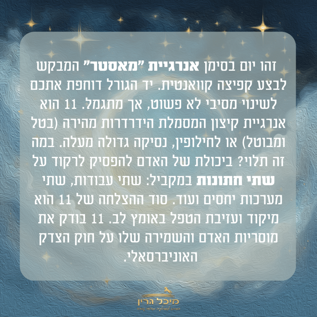 ימי משוב מהקב"ה https://michalgreen.com/%d7%99%d7%9e%d7%99-%d7%9e%d7%a9%d7%95%d7%91-%d7%9e%d7%94%d7%a7%d7%91%d7%94/ https://michalgreen.com/%d7%99%d7%9e%d7%99-%d7%9e%d7%a9%d7%95%d7%91-%d7%9e%d7%94%d7%a7%d7%91%d7%94/#respond Wed, 11 Dec 2024 09:23:03 +0000 https://michalgreen.com/?p=21313 ימי משוב מהקב"ה יום משוב הוא יום שבו הקב״ה מסמן לך האם את צועדת בדרך הנכונה למסע הנשמתי שלך. הוא נחשב כ-“יום מתנה” מאחר ואת מקבלת בו תשובות מדויקות לפעולות שעשית בתקופה האחרונה.ממש כמו שאת מפרשת חלום כשאת קמה בבוקר, ומנסה לזכור את כל הפרטים, ויודעת שלכל פרט יש משמעות – בימי משוב עלייך להתבונן על הפרטים הקטנים ולאסוף את הנתונים המתקבלים, בכדי להשתמש בהם לקידום האישי שלך.יום משוב מתקיים כאשר סך כל התאריך הקלנדרי, נותן את הספרות 4 או 7 בצמצום🤍