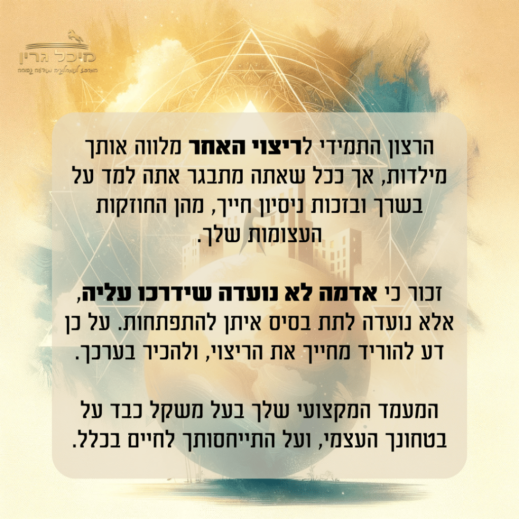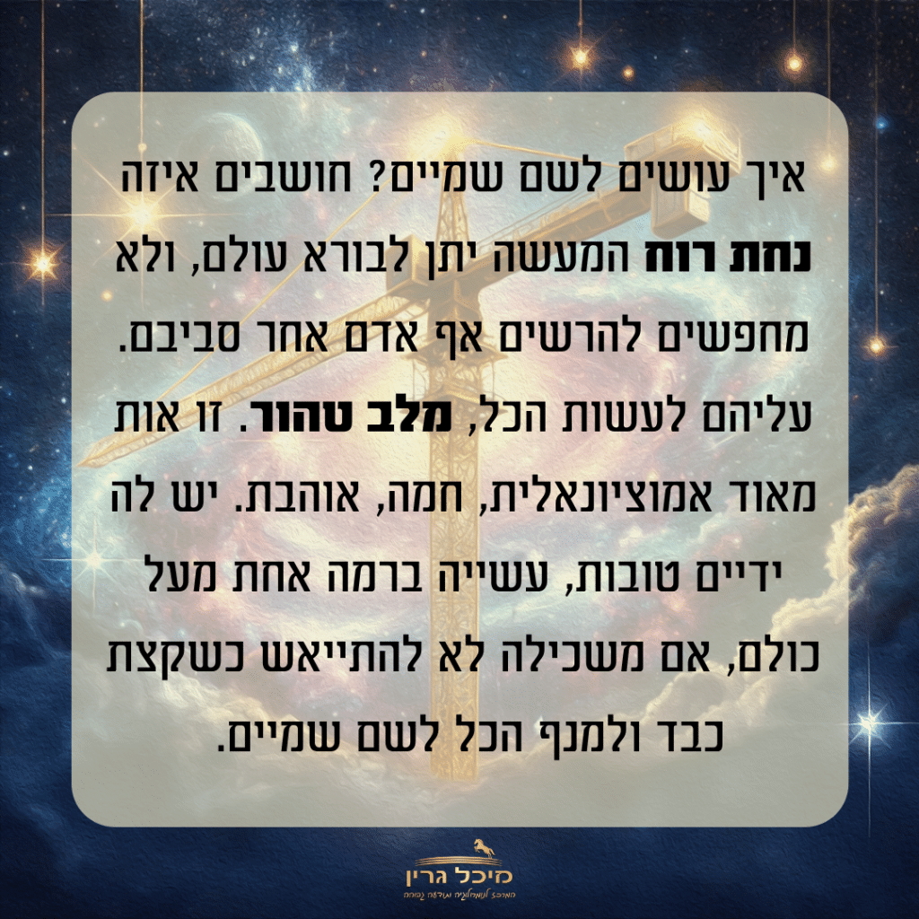 הסוד הוא לחבר את הלב שלך אליו בצורה פשוטה, כנה ונקיה. בצורה הזו אין סיכוי לכוחות הכשל להשאר. מפני שעבודת הלב היא התרופה הכי חזקה.