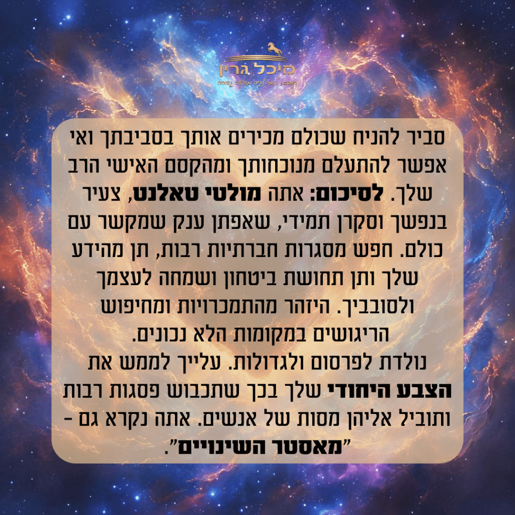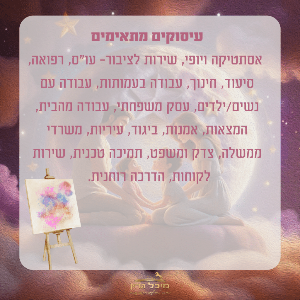 יש לה כשרונות רבים והבולט שמתוכם הוא יחסי אנוש מעולים! טוב לה לעסוק בסביבה נשית טיפולית לתת מהבינה הגבוהה שלה לזולת ולפתור בעיות ודילמות סבוכות ומורכבות.