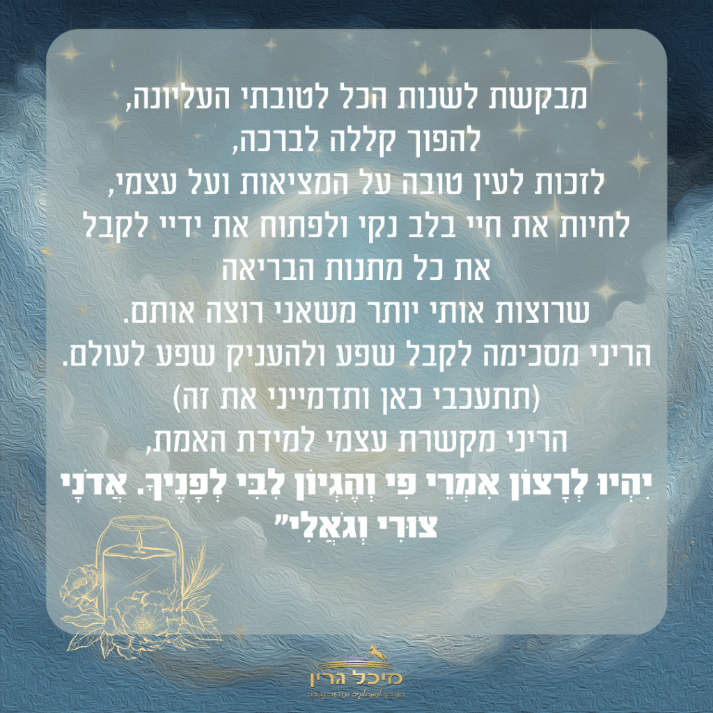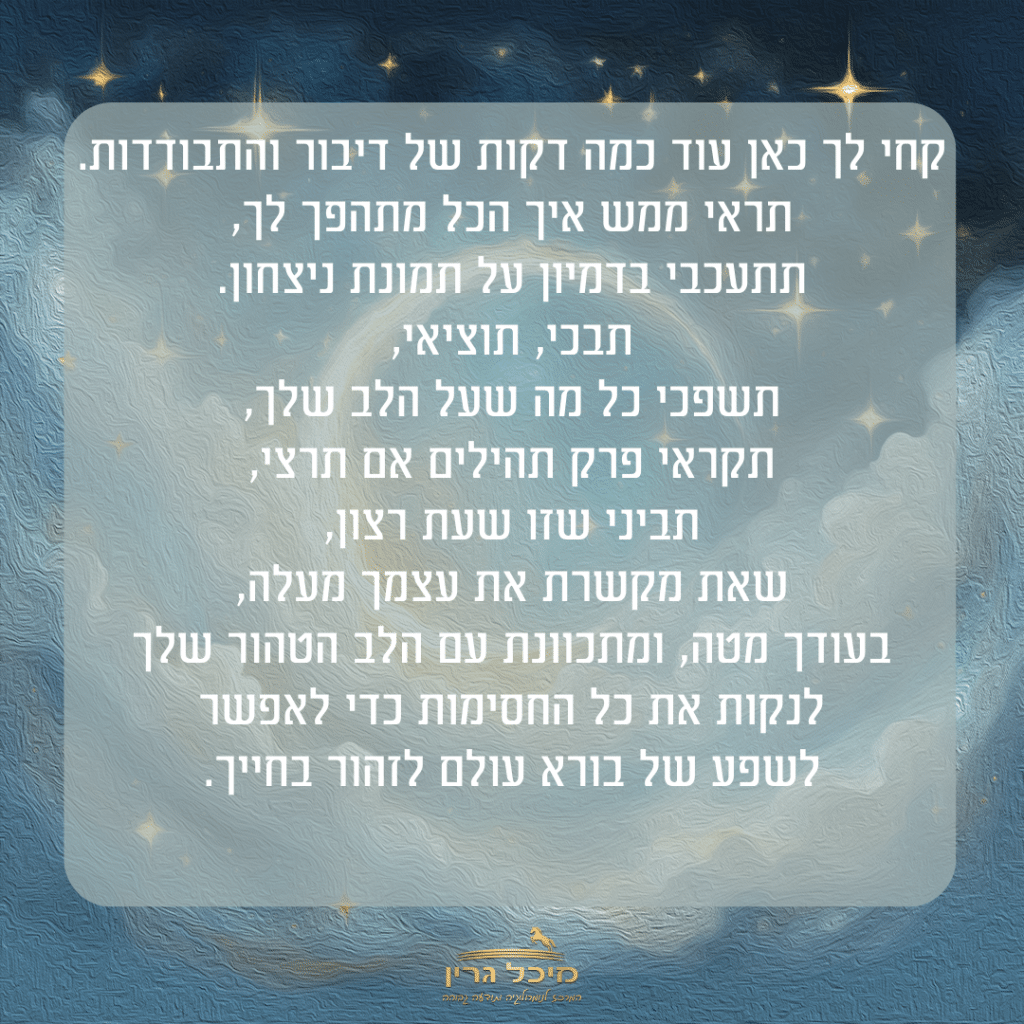 המדריך השלם להתבודדות https://michalgreen.com/%d7%94%d7%9e%d7%93%d7%a8%d7%99%d7%9a-%d7%94%d7%a9%d7%9c%d7%9d-%d7%9c%d7%94%d7%aa%d7%91%d7%95%d7%93%d7%93%d7%95%d7%aa/ https://michalgreen.com/%d7%94%d7%9e%d7%93%d7%a8%d7%99%d7%9a-%d7%94%d7%a9%d7%9c%d7%9d-%d7%9c%d7%94%d7%aa%d7%91%d7%95%d7%93%d7%93%d7%95%d7%aa/#respond Wed, 04 Sep 2024 07:55:57 +0000 https://michalgreen.com/?p=18452 המדריך השלם להתבודדות אם חשבת איך לפתור ביעילות אתגרים, להתעלות מעל עצבות ולהחזיר את האור לנשמה שלך – הפוסט הזה בשבילך לכבוד ראש חודש אלול, הכנתי לך את המדריך השלם להתבודדות עם הקב״ה 💜הקב״ה מביא לא פעם לחייך אתגרים רק כדי שתחזרי לדבר איתו ותנתקי את החבל מכוחות הכשל. הסוד הוא לחבר את הלב שלך אליו בצורה פשוטה, כנה ונקיה. בצורה הזו אין סיכוי לכוחות הכשל להשאר. מפני שעבודת הלב היא התרופה הכי חזקה.אז איך עושים את זה?