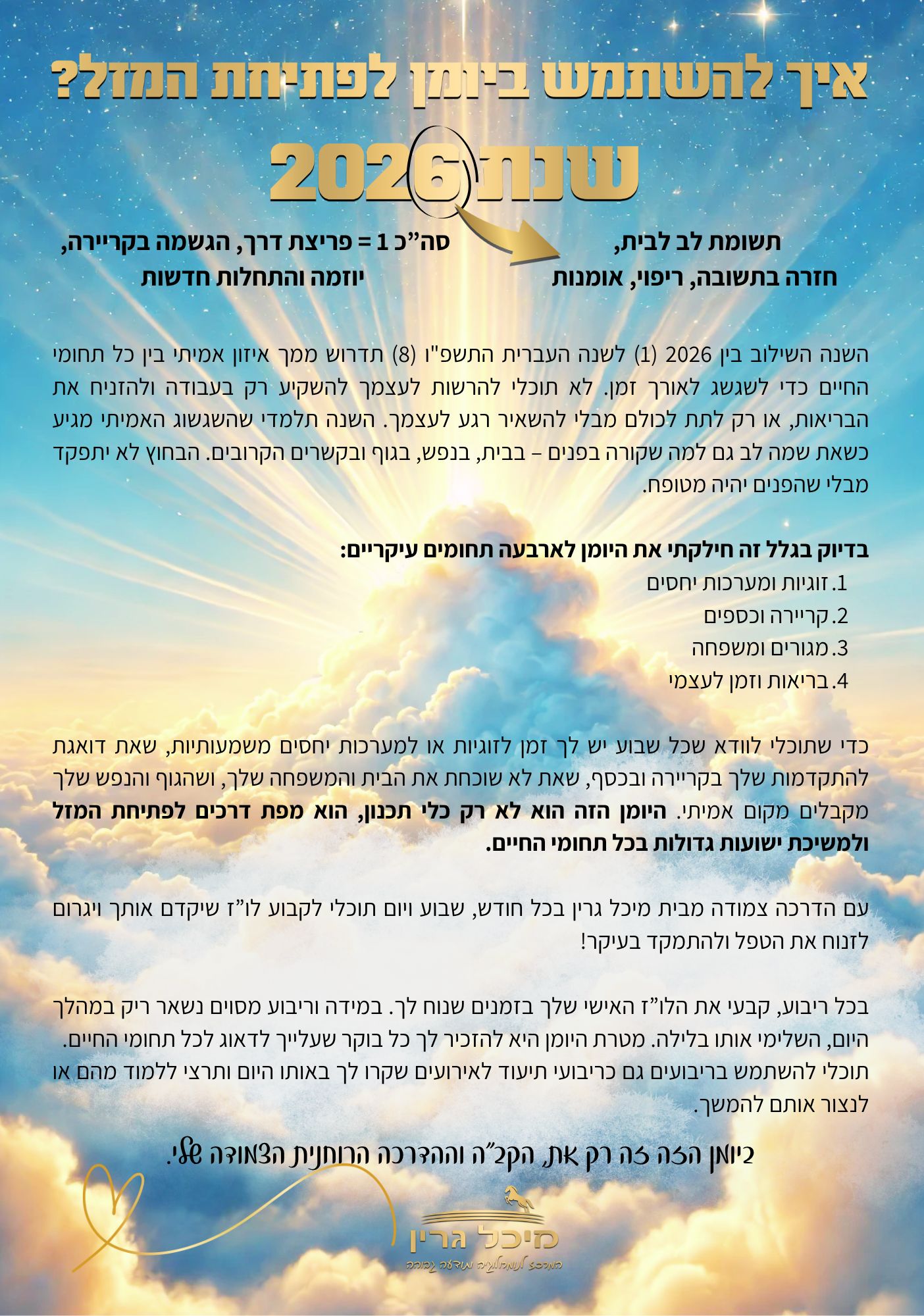 כל יום ביומן מחולק ל-4 תחומי חיים בהתאם לאנרגיה השנתית של 2026 התשפ"ו היוצרות את הספרות 1 מול 8,