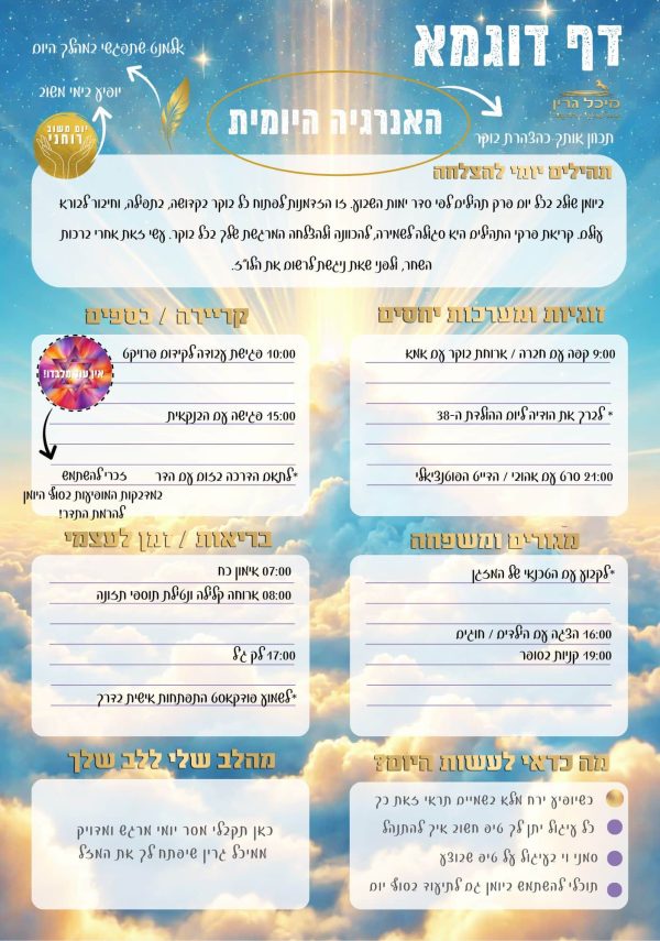 ביומן תוכלי לנהל את הלו"ז היומי לפי תחומי החיים שלך בהתאם לאנרגיה הקוסמית ולתעד את הניסים והקסמים שפוקדים אותך מדי יום.