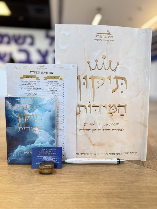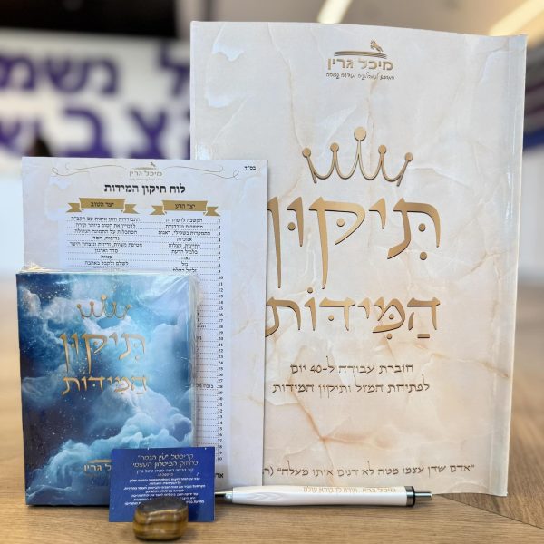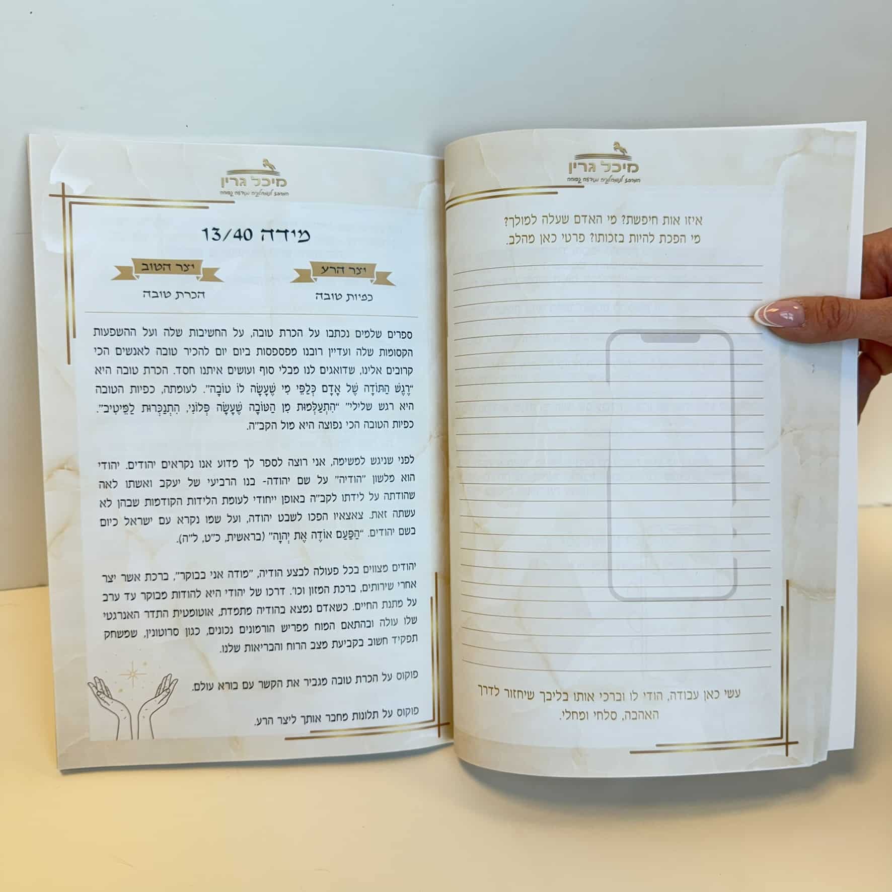 החוברת מגיעה עם מגנט לוח תיקון המידות למקרר + עט בצבע פנינה עם חריטת זהב עם הכיתוב "תודה לך בורא עולם".